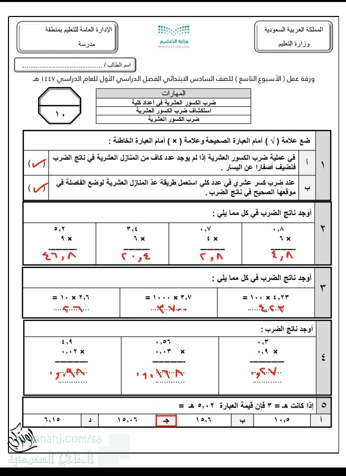 5. الصف السادس, رياضيات, ورقة عمل الأسبوع التاسع نموذج بورقة واحدة