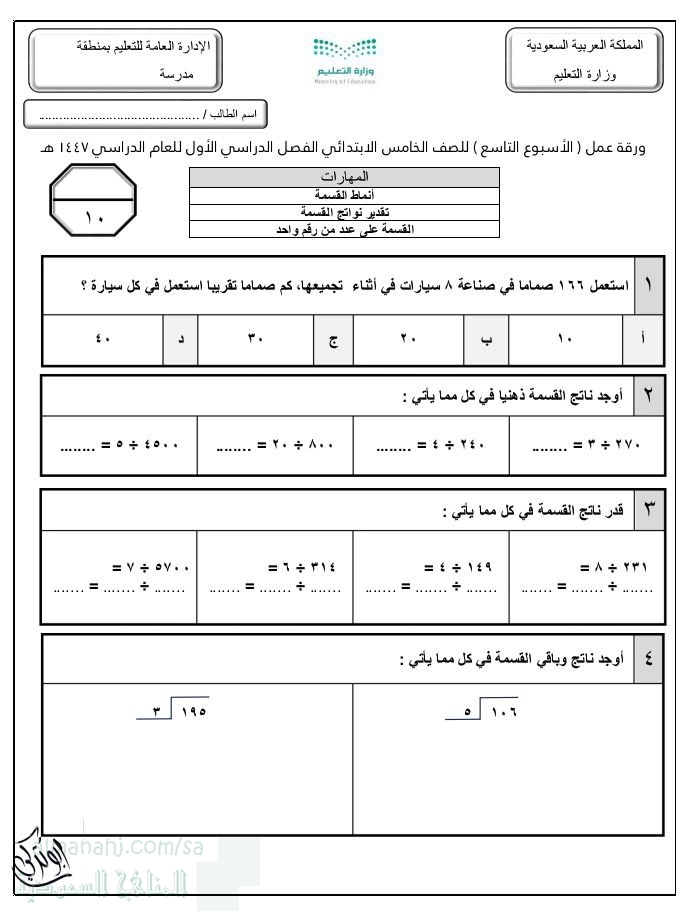 معلومات الملف: ورقة عمل للأسبوع التاسع من الفصل الأول للعام 1447ه‍ نموذج بورقة واحدة المهارات المستهدفة: أنماط القسمة تقدير نواتج القسمة القسمة على عدد من رقم واحد