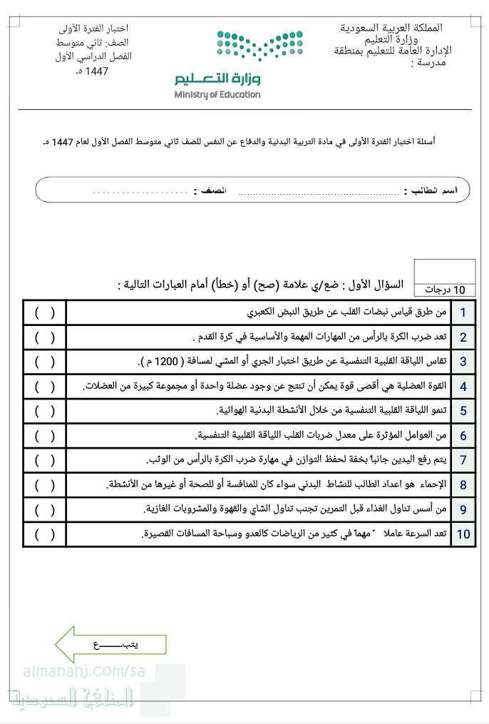 3. التربية البدنية, الفصل الأول, 1447_1448, اختبار الفترة الأولى البدنية والدفاع عن النفس