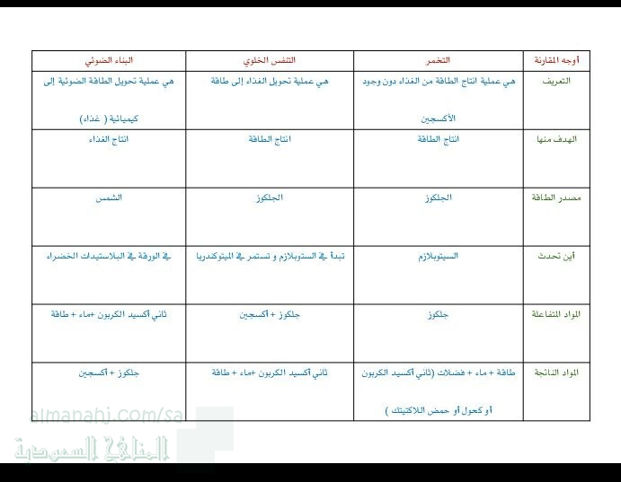 1. علوم, الفصل الأول, 1447_1448, مقارنة بين البناء الضوئي و التنفس الخلوي و التخمر