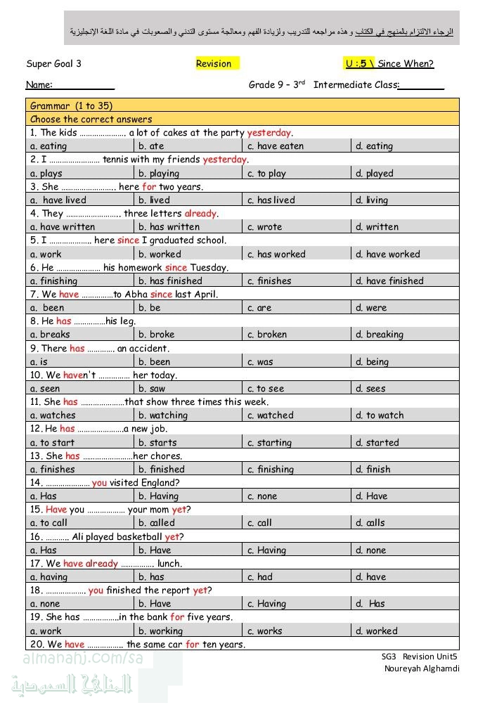 مراجعة الوحدة الخامسة since then غير محلولة