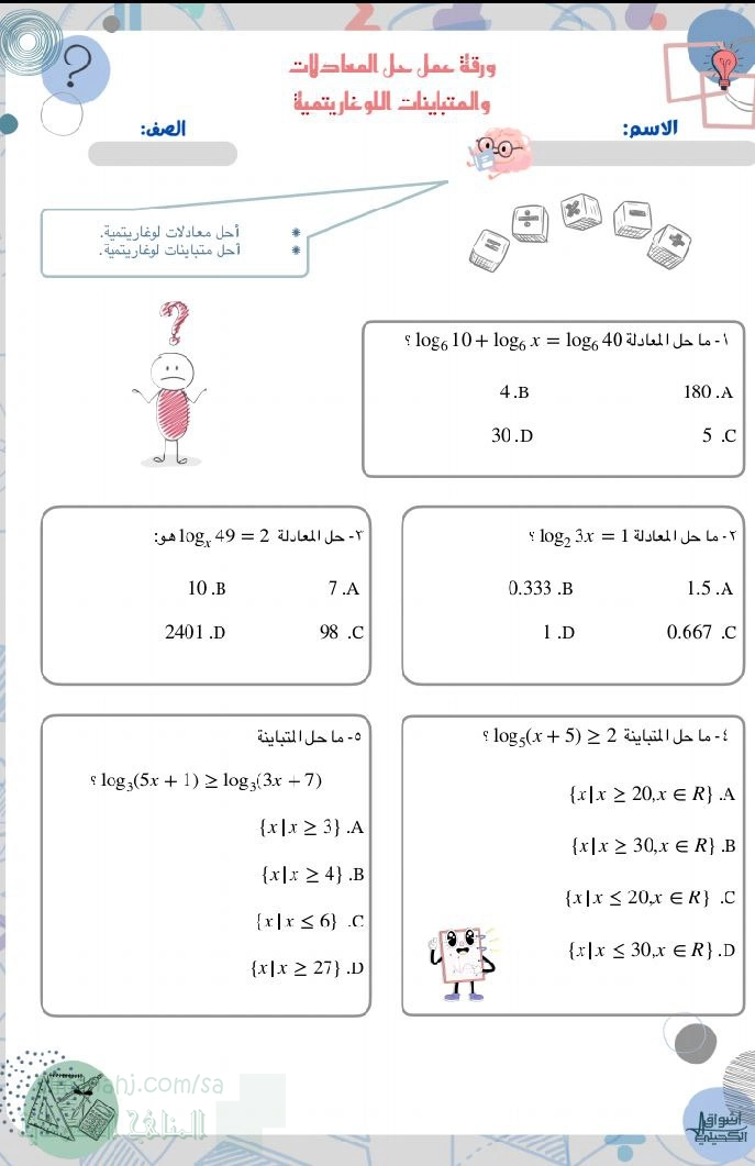 معلومات الملف: ورقة عمل درس حل المعادلات و المتباينات اللوغاريتمية من مقرر الفصل الأول 1447ه‍ المهارات المستهدفة من ورقة العمل: _ أحل معادلات لوغاريتمية _ أحل متباينات لوغاريتمية