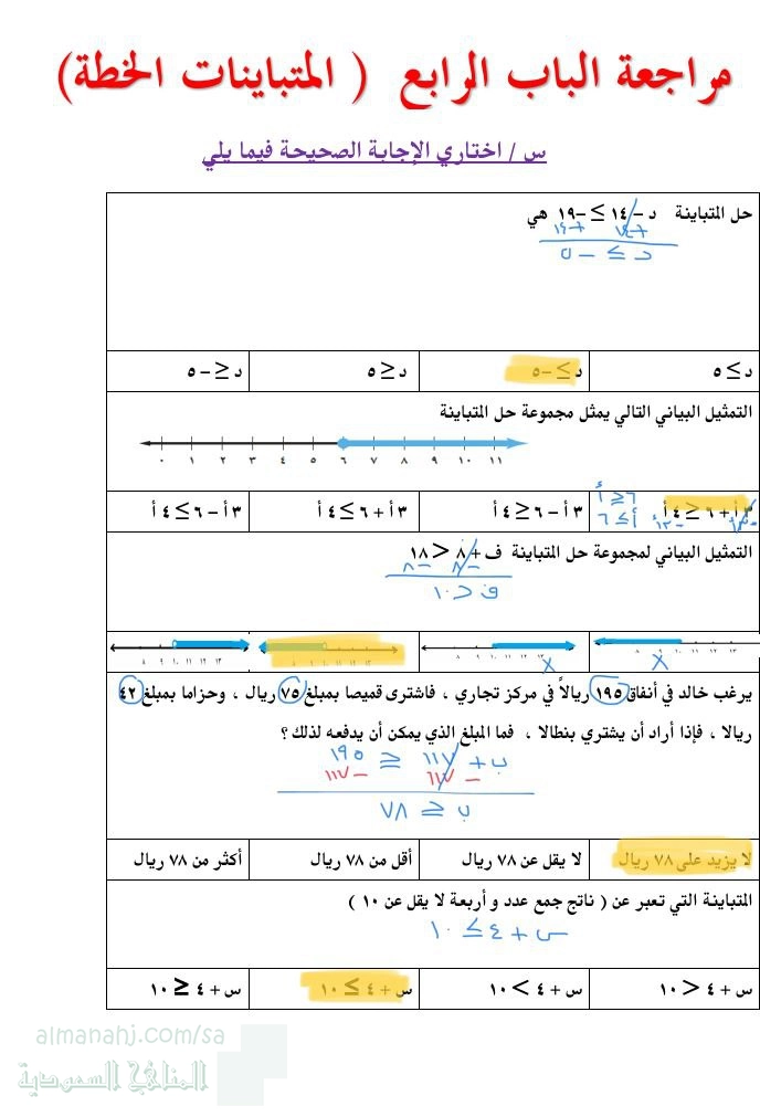 7. الصف الثالث المتوسط, رياضيات, مراجعة الباب الرابع المتباينات الخطية محلولة