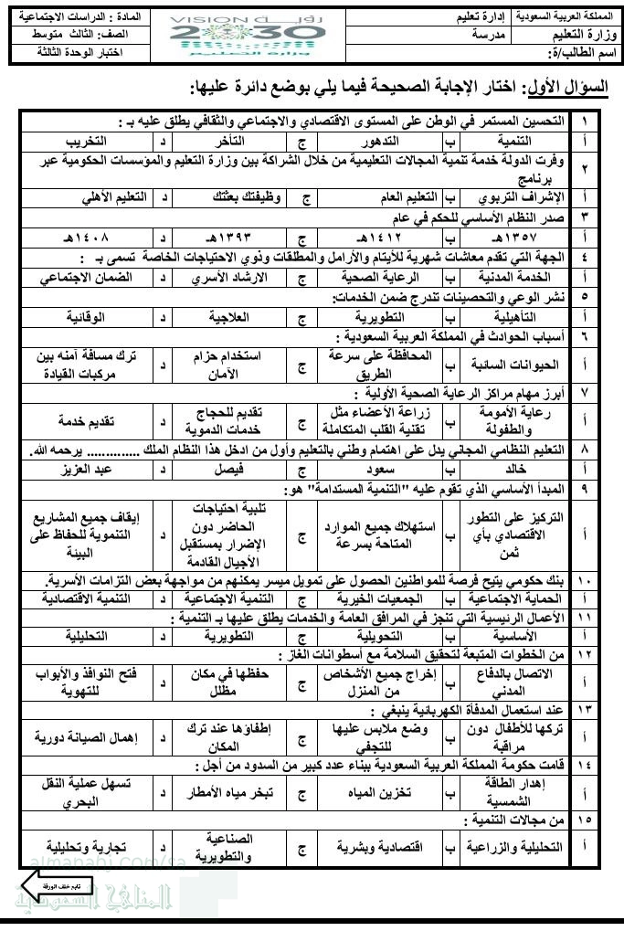 2. اجتماعيات, الفصل الأول, 1447_1448, اختبار وحدة التنمية الوطنية