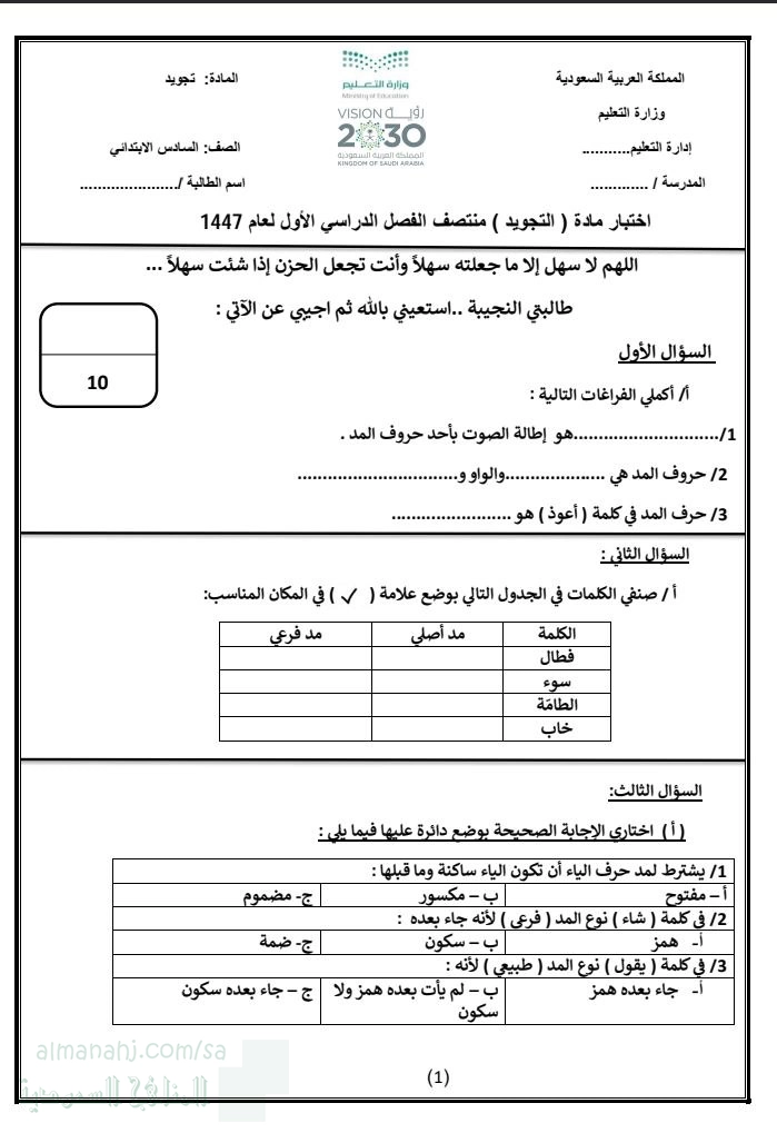 معلومات الملف: نموذج اختبار الفترة الأولى من الفصل الأول 1447ه‍ في مادة التجويد تقيس الأسئلة مهارات المد ، تصنيف كلمات حسب نوع المد أصلي أو فرعي