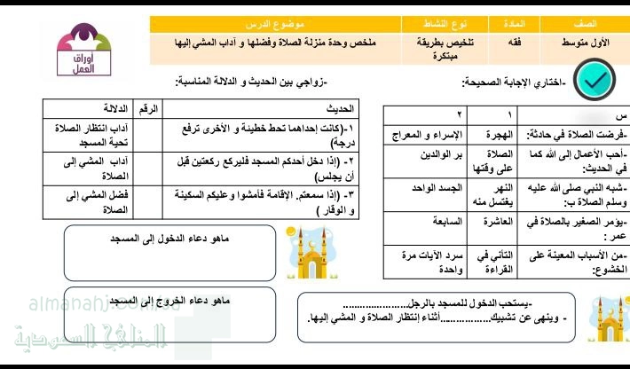 | 3. الصف الأول المتوسط, دراسات اسلامية, ورقة عمل ملخص وحدة منزلة الصلاة و فضلها و آداب المشي إليها قبل 2 ساعات | المشاهدات: 53