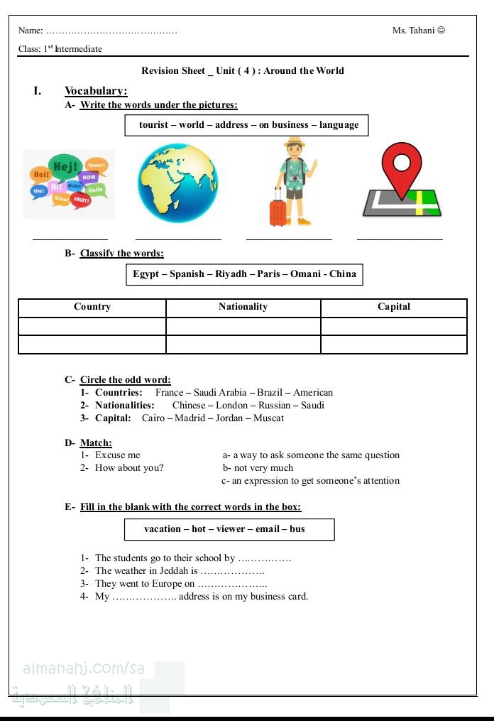 4. الصف الأول المتوسط, لغة انجليزية, ورقة عمل مراجعة للوحدة الرابعة arround the world