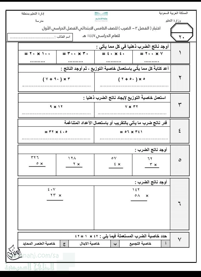 1. الصف الخامس, رياضيات, اختبار الفصل الثالث الضرب