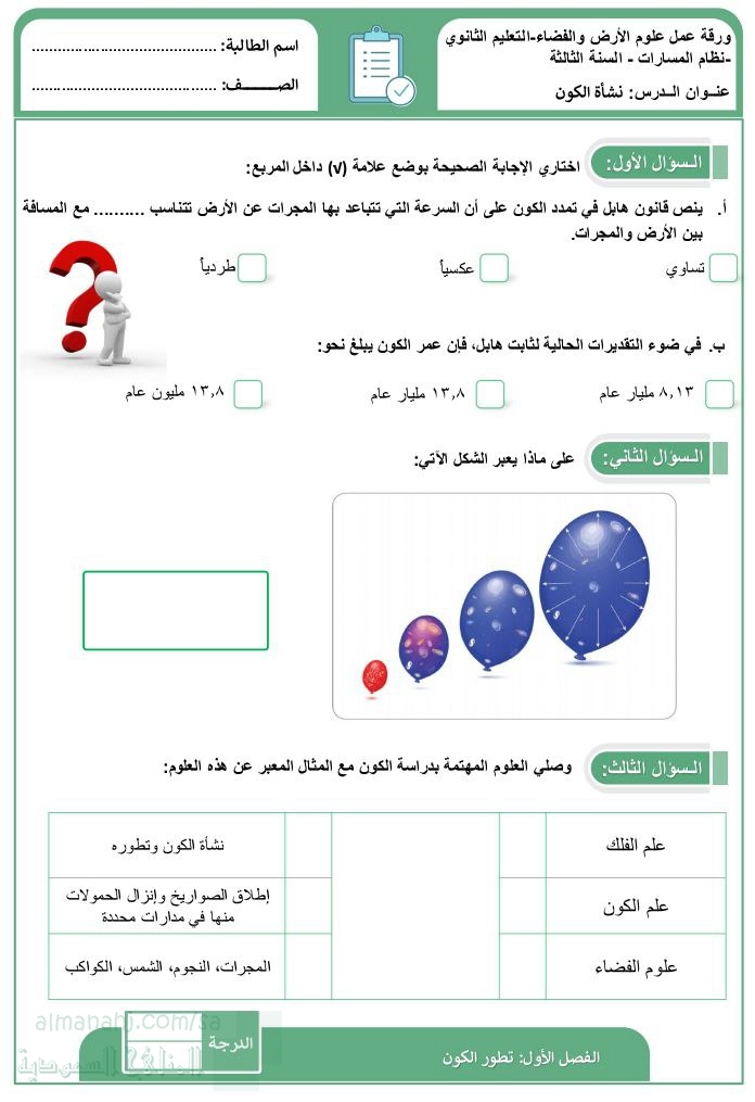 1. الصف الثاني الثانوي, علوم, جميع أوراق عمل علم الأرض والفضاء