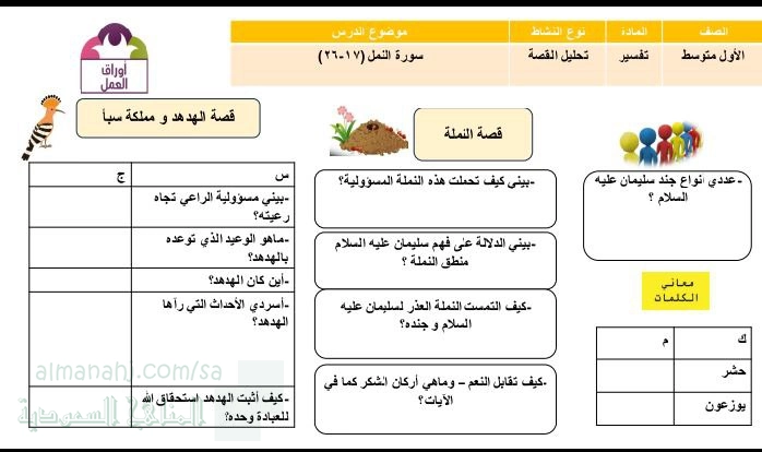 معلومات الملف: ورقة عمل سورة النمل من الآية 17 حتى الآية 26 من منهج الإسلامية قسم التفسير ، نوع النشاط: تحليل القصة الهدف أن يعدد الطالب أنواع جند النبي سليمان عليه السلام