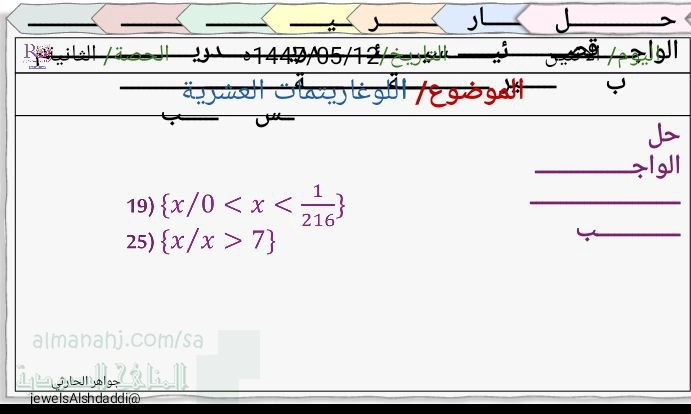 9. رياضيات, الفصل الأول, 1447_1448, ورقة عمل درس حل المعادلات والمتباينات اللوغاريتمية