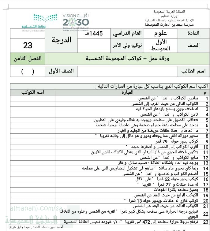 4. الصف الأول المتوسط, علوم, ورقة عمل درس كواكب المجموعة الشمسية