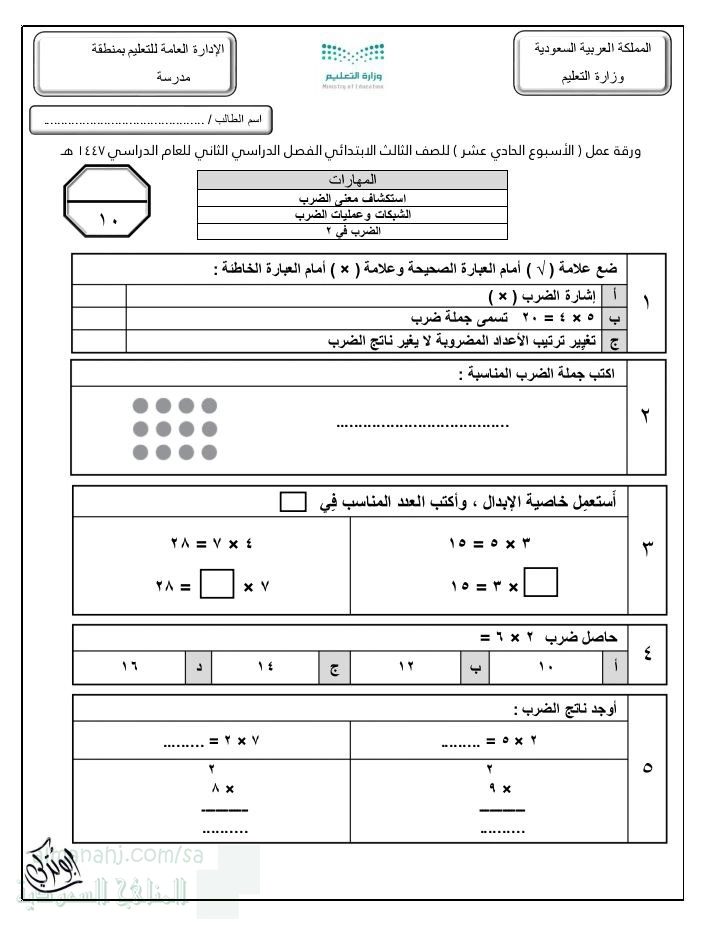 7. الصف الثالث, رياضيات, ورقة عمل الأسبوع الحادي عشر الضرب
