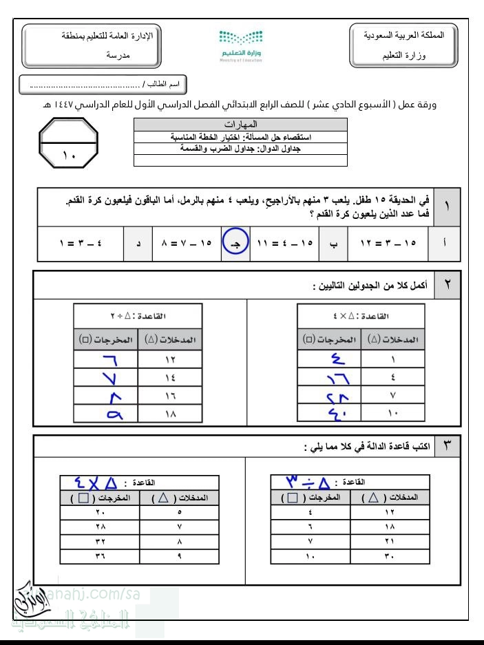 معلومات الملف: نموذج حل ورقة عمل للأسبوع الحادي عشر نموذج بورقة واحدة، المهارات المستهدفة : _ استقصاء حل المسألة اختيار الخطة المناسبة _ جداول الدوال جداول الضرب و القسمة | ||