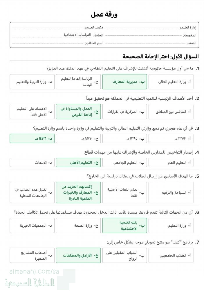 1. اجتماعيات, الفصل الأول, 1447_1448, ورقة عمل التنمية الإجتماعية مع الإجابة