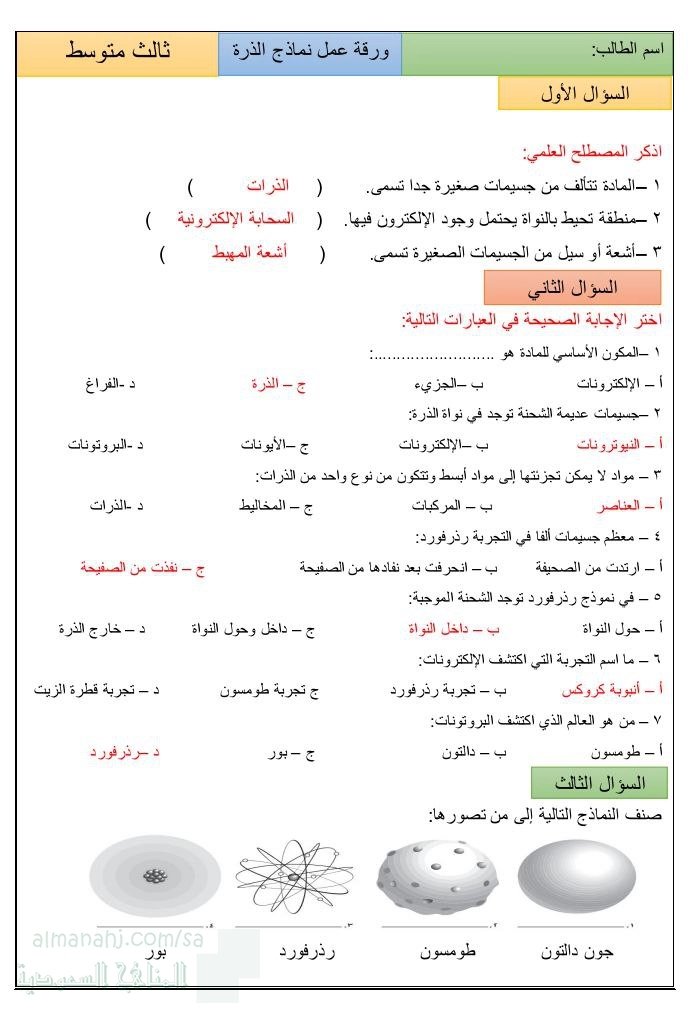 تم إيجاد الملف: إجابة ورقة عمل نماذج الذرة