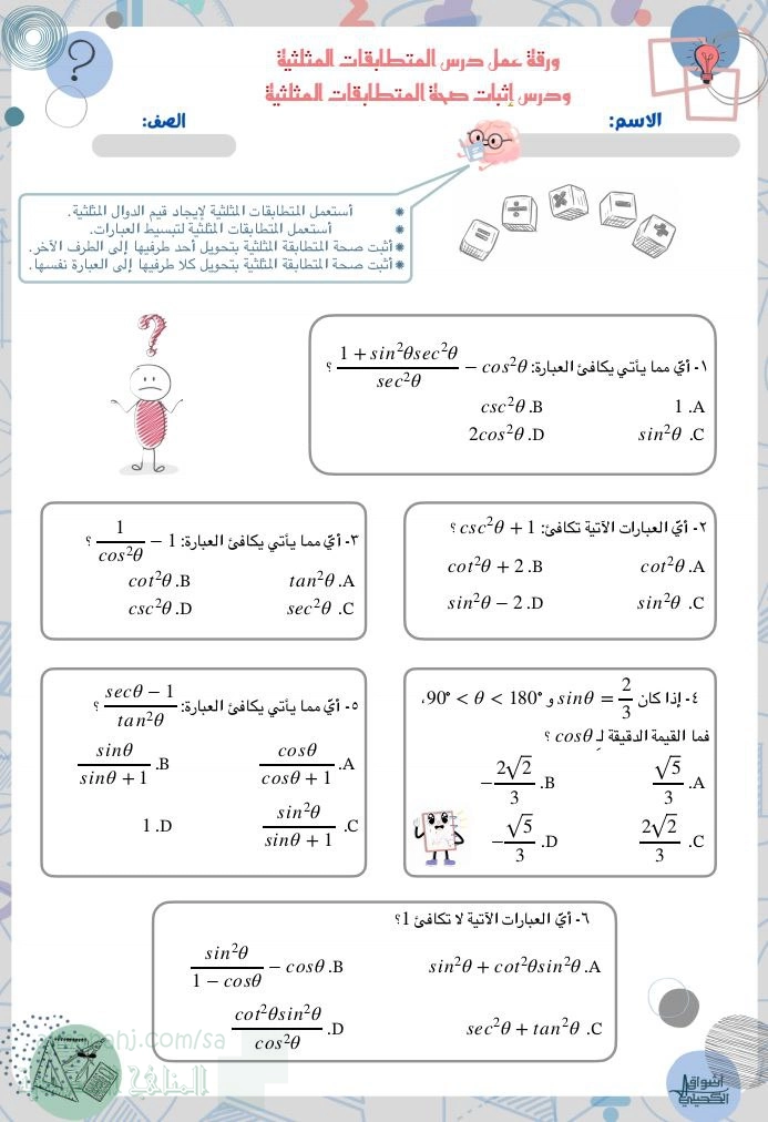 | ورقة عمل درس المتطابقات المثلثية و درس إثبات صحة المتطابقات المثلثية | ||