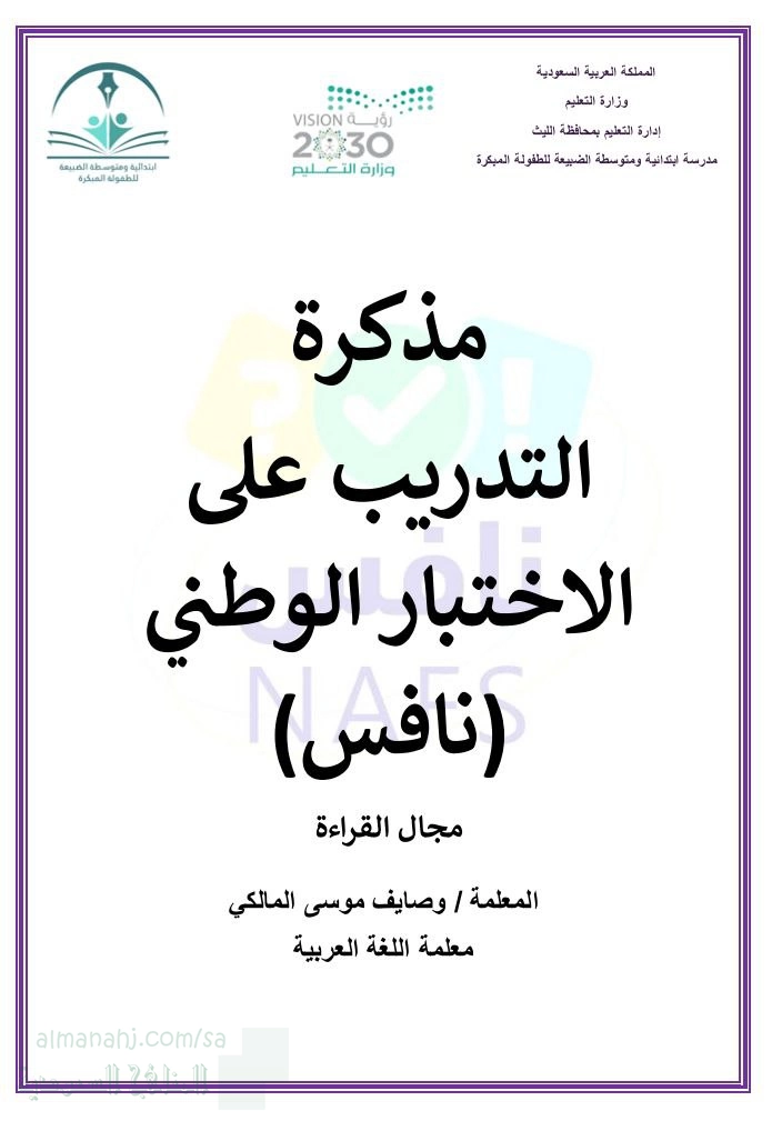 | مذكرة التدريب على الاختبار الوطني نافس مجال القراءة - إعداد: وصايف موسى المالكي | ||