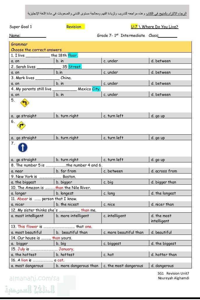 معلومات الملف: مراجعة وتمارين تقوية للوحدة السابعة Where Do you live من منهج اللغة الإنجليزية super goal 1 للفصل الأول من العام 1447ه‍