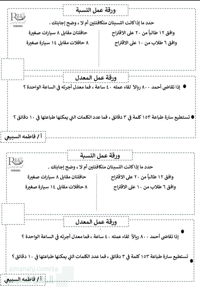 ورقة عمل النسبة و المعدل, فاطمة السبيعي, الصف الأول المتوسط, رياضيات, الفصل الأول, 1447_1448 - المناهج السعودية