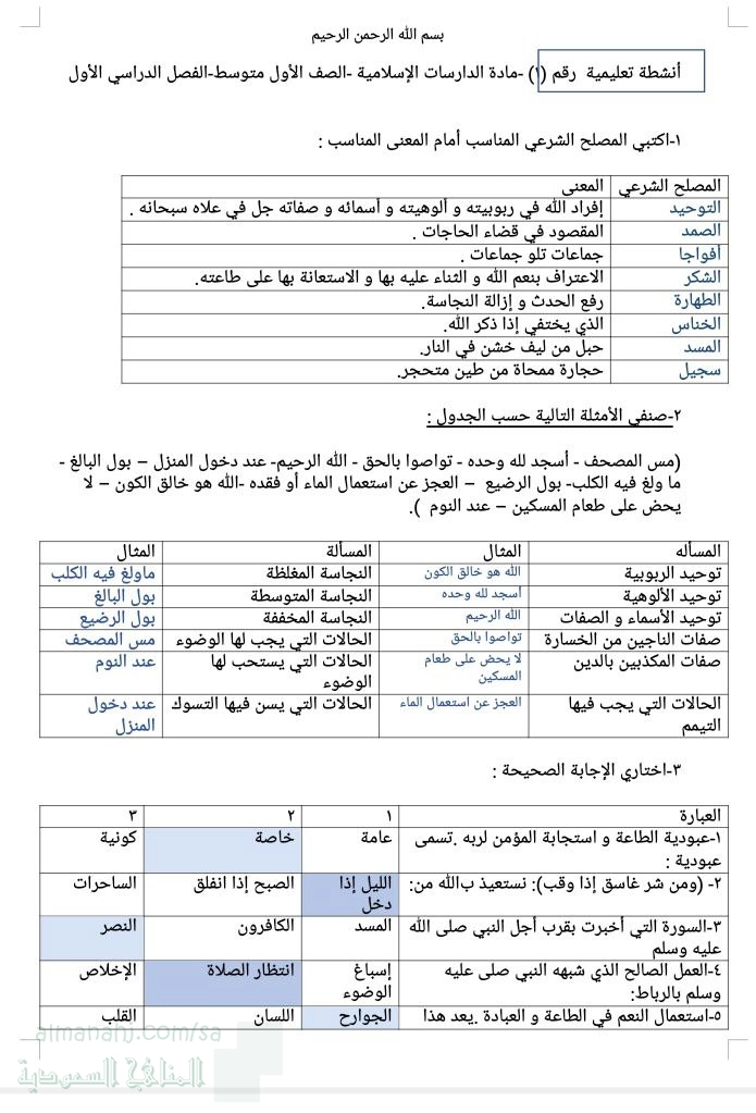 1. الصف الأول المتوسط, دراسات اسلامية, مراجعة شاملة للمنهج مع الإجابات