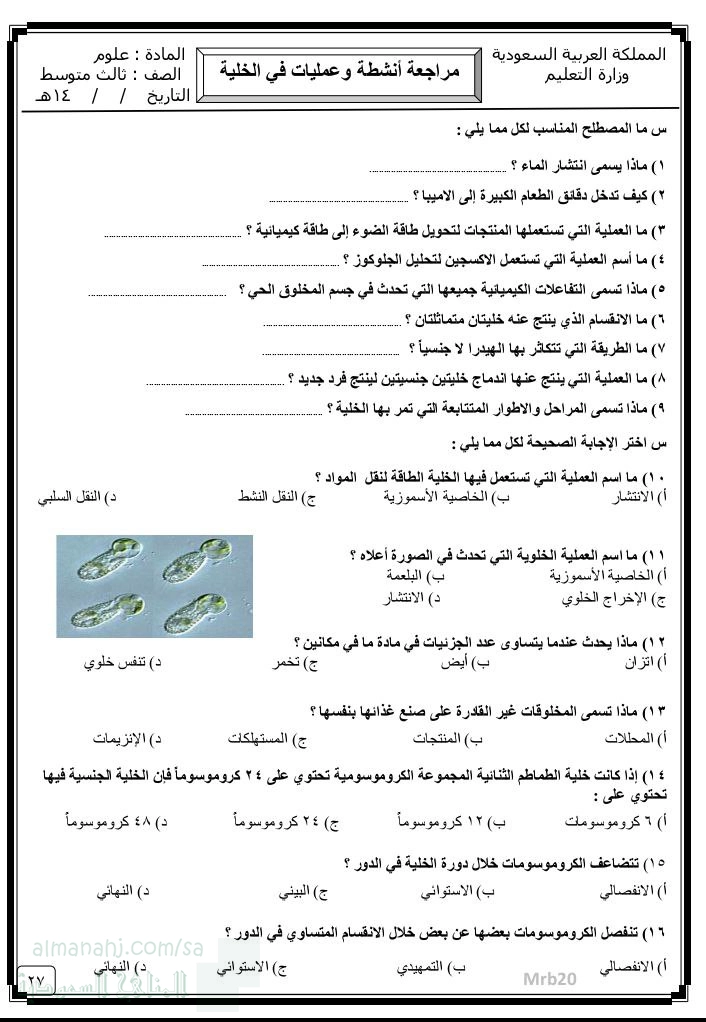 معلومات الملف: أسئلة مراجعة الفصل الثالث أنشطة وعمليات في الخلية غير محلولة من مقرر علوم الفصل الأول 1447ه‍ الأسئلة شاملة و مننوعة بعضها مقالي والباقي موضوعي