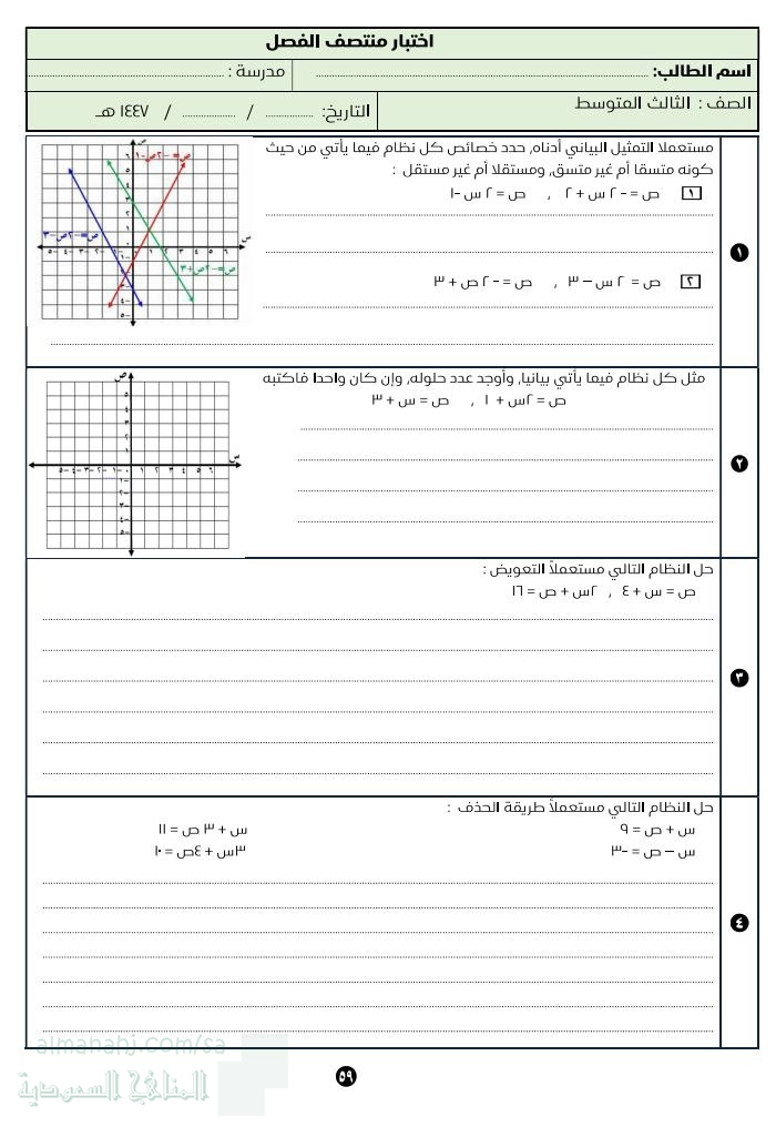 | اختبار منتصف الفصل الخامس أنظمة المعادلات الخطية | ||