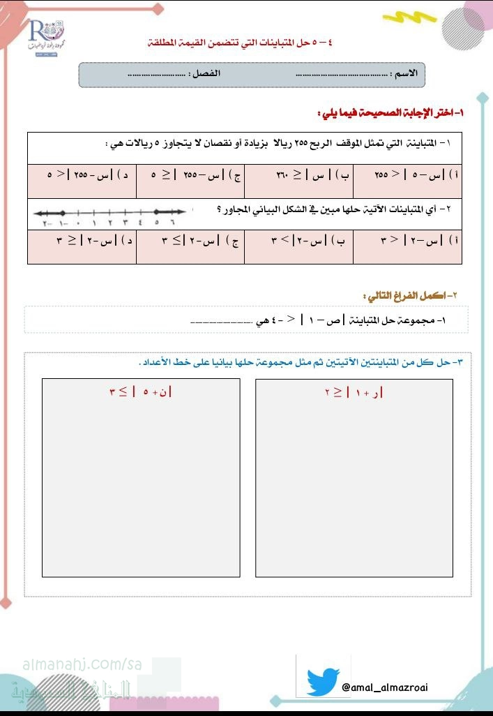 تم إيجاد الملف: ورقة عمل درس حل المتباينات الخطية التي تتضمن القيمة المطلقة