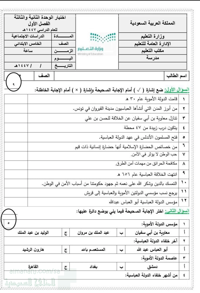 معلومات الملف: نماذج اختبار الفترة الثانية من الفصل الأول للعام 1447ه للوحدتين الثانية: التاريخ الإسلامي : التي تتضمن الدروس _ الدولة الأموية ، _ الدولة العباسية _ الحضارة الإسلامية و الوحدة الثالثة الأمن الوطني : التي تتضمن الدرسين _ الأمن _ أجهزة الأمن | ||