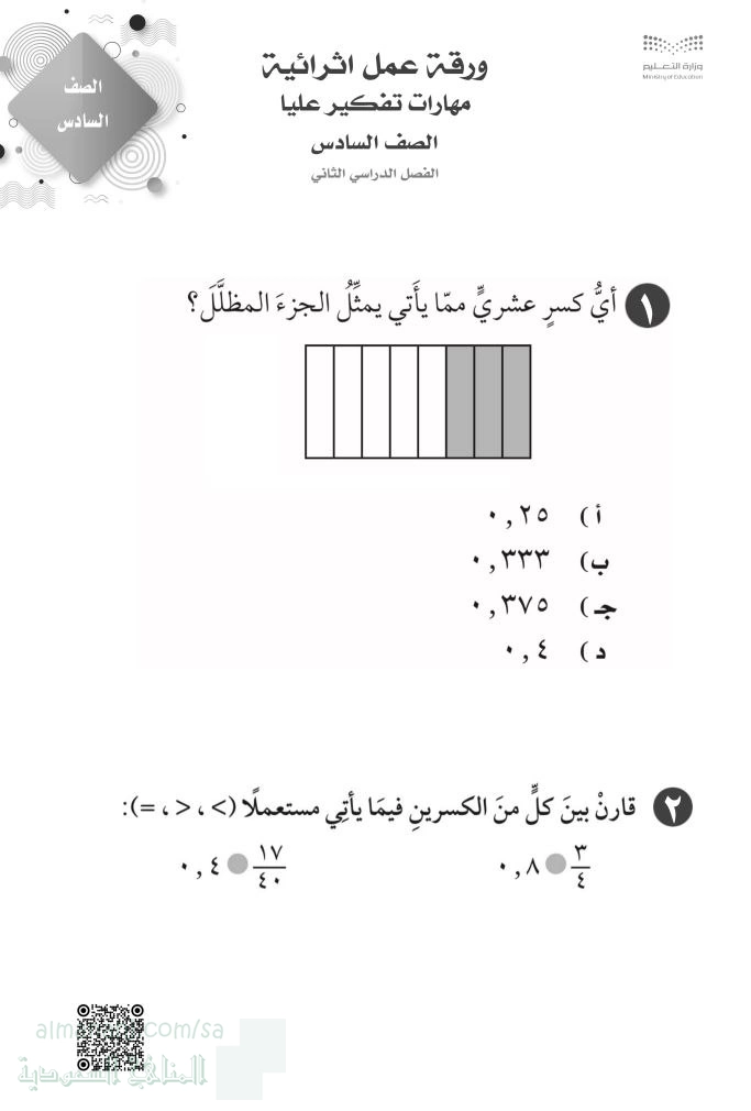 2. الصف السادس, رياضيات, ورقة عمل اثرائية