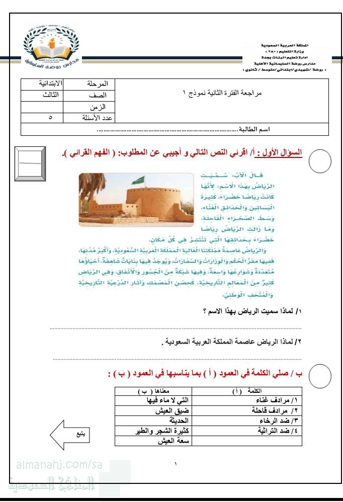 2. الصف الثالث, لغة عربية, مراجعة لغتي الفترة الثانية نموذج 1
