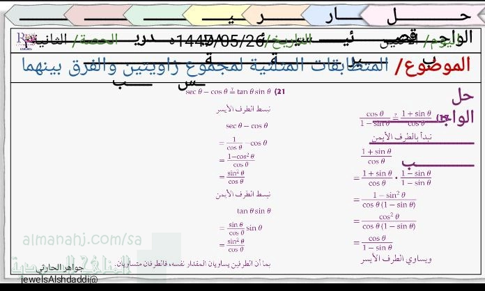 | عرض بوربوينت لدرس المتطابقات المثلثية لمجموع زاويتين والفرق بينهما - إعداد: جواهر الحارثي | ||