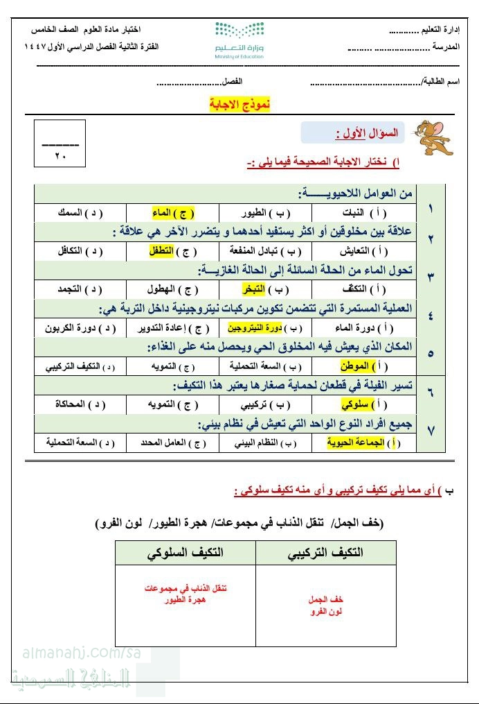معلومات الملف: نموذج الإجابة على أسئلة اختبار الفترة الثانية للفصل الأول من العام 1447ه‍ الذي قدمناه لكم في ملف سابق المقال نموذج اختبار الفترة الثانية للفصل الأول 1447ه‍ ، الأسئلة متنوعة وتقيس مهارة الطالب في : تعريف الموطن ، تغير حالات المادة ، التكيف ، التمييز بين التكيف التركيبي و التكيف السلوكي أسباب تغير الأنظمة البيئية ، دورة الماء
