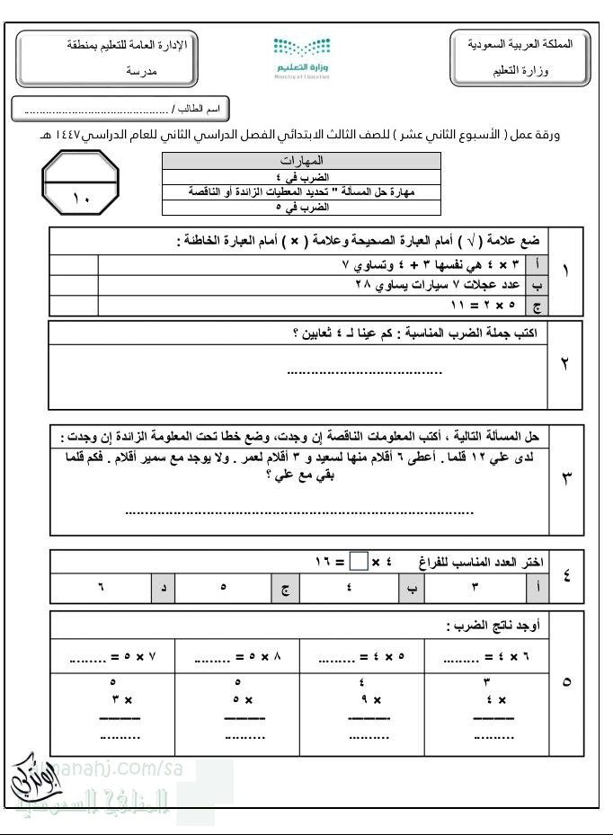 معلومات الملف: ورقة عمل الأسبوع الثاني عشر نموذج بورقة واحدة لدرس الضرب في الرقم أربعة 4 ، الضرب في الرقم خمسة 5 المهارات المستهدفة الضرب في أربعة مهارة حل المسألة - تحديد المعطيات الزائدة أو الناقصة الضرب في خمسة | ||