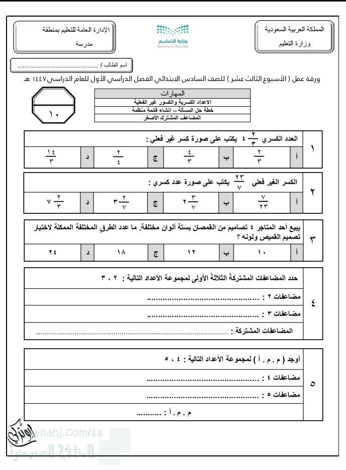 معلومات الملف: ورقة عمل الأسبوع الثالث عشر نموذج بورقة واحدة ، المهارات المستهدفة : _ الأعداد الكسرية و الكسور غير الفعلية _ خطة حل المسألة انشاء قائمة منظمة _ المضاعف المشترك الأصغر | ||