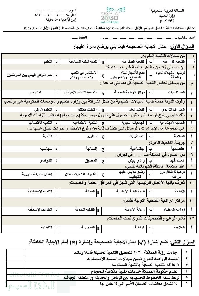 | اختبار الوحدة الثالثة التنمية للفترة الثانية للفصل الأول 1447ه | ||