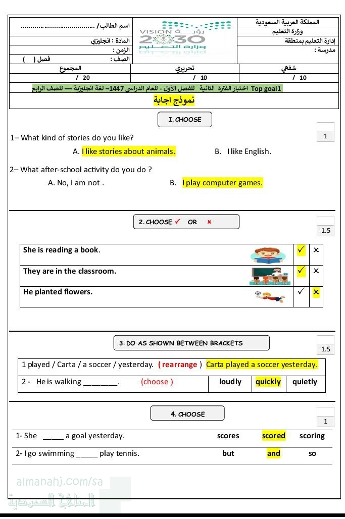 معلومات الملف: نموذج حل الاختبار التحريري للفترة الثانية من الفصل الأول 1447ه لمنهج اللغة الإنجليزية Top goal 1 الذي قدمناه في ملف سابق. الأسئلة متنوعة تقيس مهارات الطالب في معرفة المفردات و المعاني وفي قاعدة الماضي البسيط والتعبير عن صورة | ||