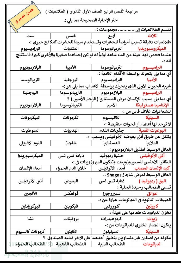1. الصف الأول الثانوي, علوم, حل مراجعة الفصل الرابع الطلائعيات