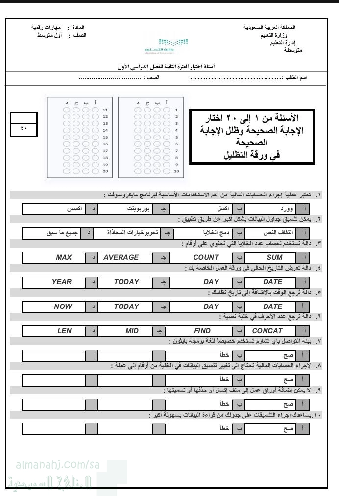 15. الصف الأول المتوسط, المهارات الرقمية, حل اختبار الفترة الثانية لمنهج الرقمية