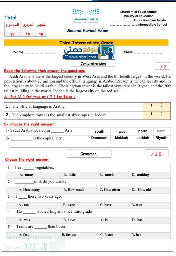 1. لغة انجليزية, الفصل الأول, 1447_1448, نماذج اختبارات super goal 3 محلولة الفترة الثانية