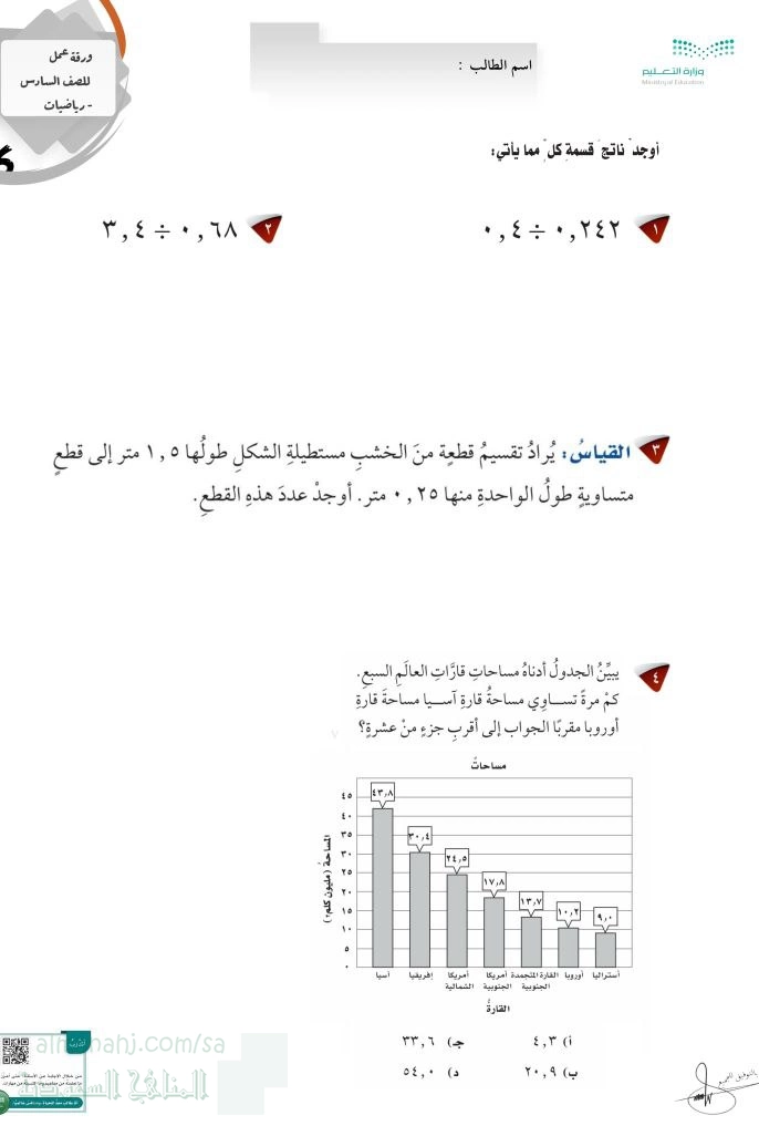 1. الصف السادس, رياضيات, ورقة عمل على الكسور العشرية