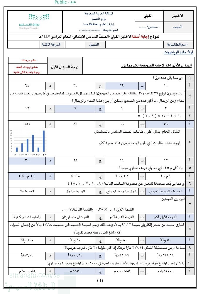 10. الصف السادس, رياضيات, اختبار الفترة الثانية للفصل الأول 1447ه