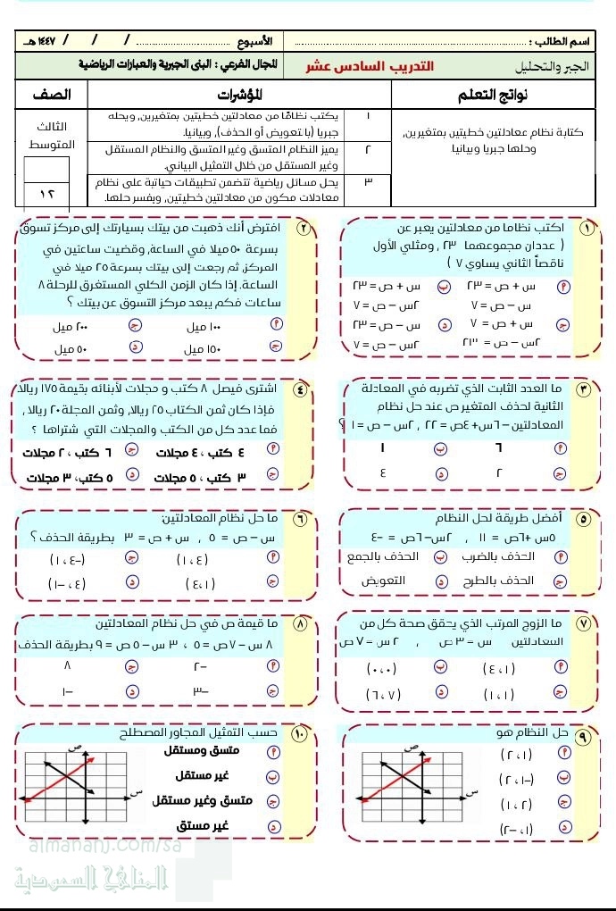 معلومات الملف: تدريب نافس للأسبوع السادس عشر في مجال الرياضيات الجبر و التحليل ، المجال الفرعي : البنى الجبرية و العبارات الرياضية , نواتج التعلم : كتابة نظام معادلتين خطيتين بمتغيربن و حلها جبرياً و بيانياً | ||