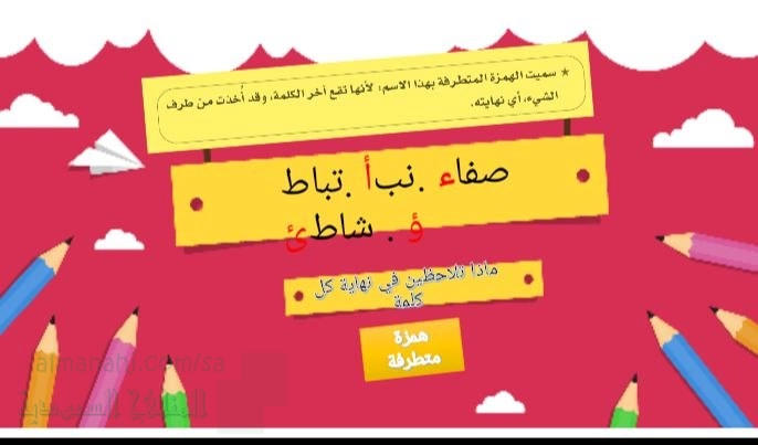 معلومات الملف: عرض بوربوينت لدرس الظاهرة الإملائية الهمزة المتطرفة من مقرر لغتي الخالدة للفصل الأول 1447ه، يتعرف الطلبة في هذا الملف على : _ سبب تسمية الهمزة بهذا الإسم _ الإرتباط بين كنابة الهمزة والحركات | ||