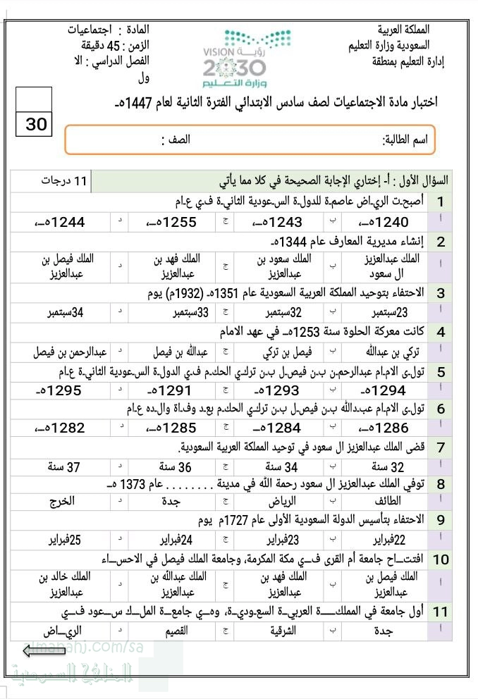 | نموذج اختبار اجتماعيات الفترة الثانية 1447ه | ||