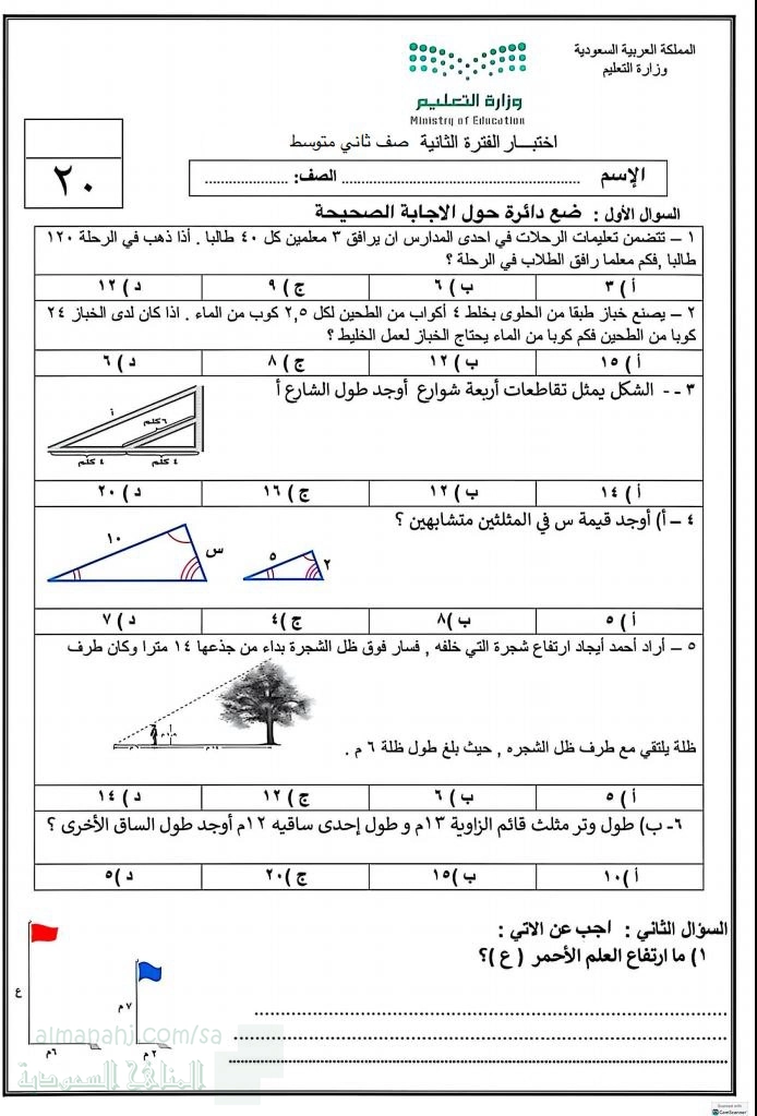 تم إيجاد الملف: نموذج اختبار الفترة الثانية لمقرر رياضيات الفصل الأول