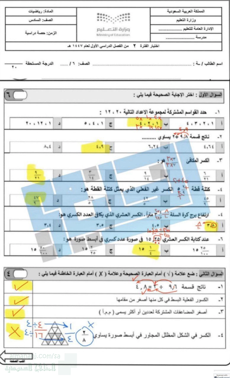 5. الصف السادس, رياضيات, نموذج اختبار للفترة الثانية