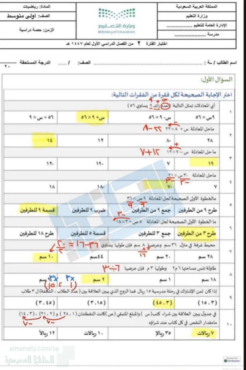 4. الصف الأول المتوسط, رياضيات, حل اختبار الفترة الثانية