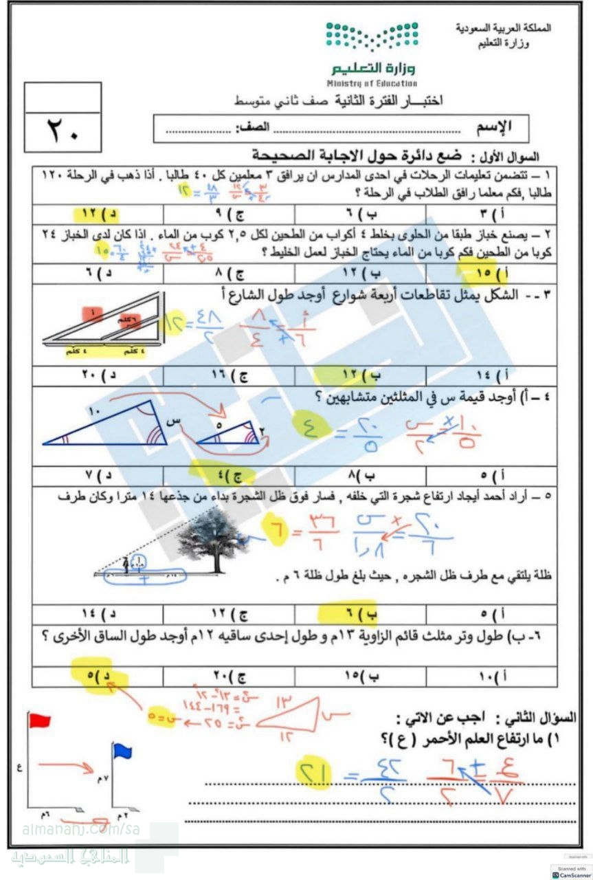 5. رياضيات, الفصل الأول, 1447_1448, اختبار الفصل الثالث النسبة والتشابه