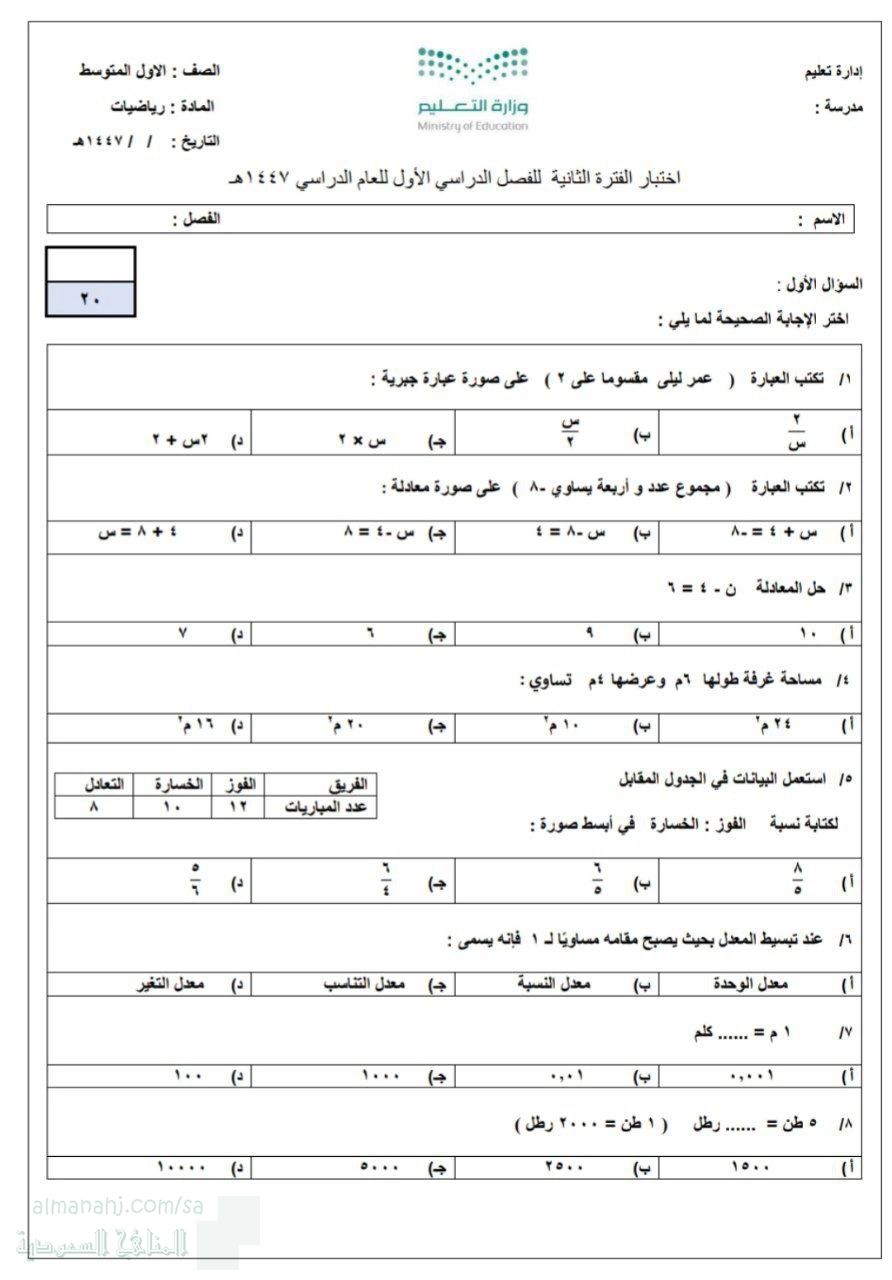 تم إيجاد الملف: اختبار الفترة الثانية حول الجبر والقياس والنسبة